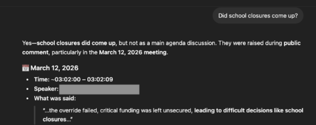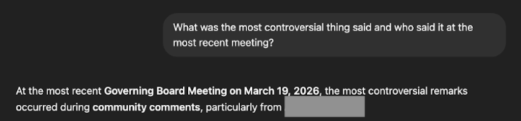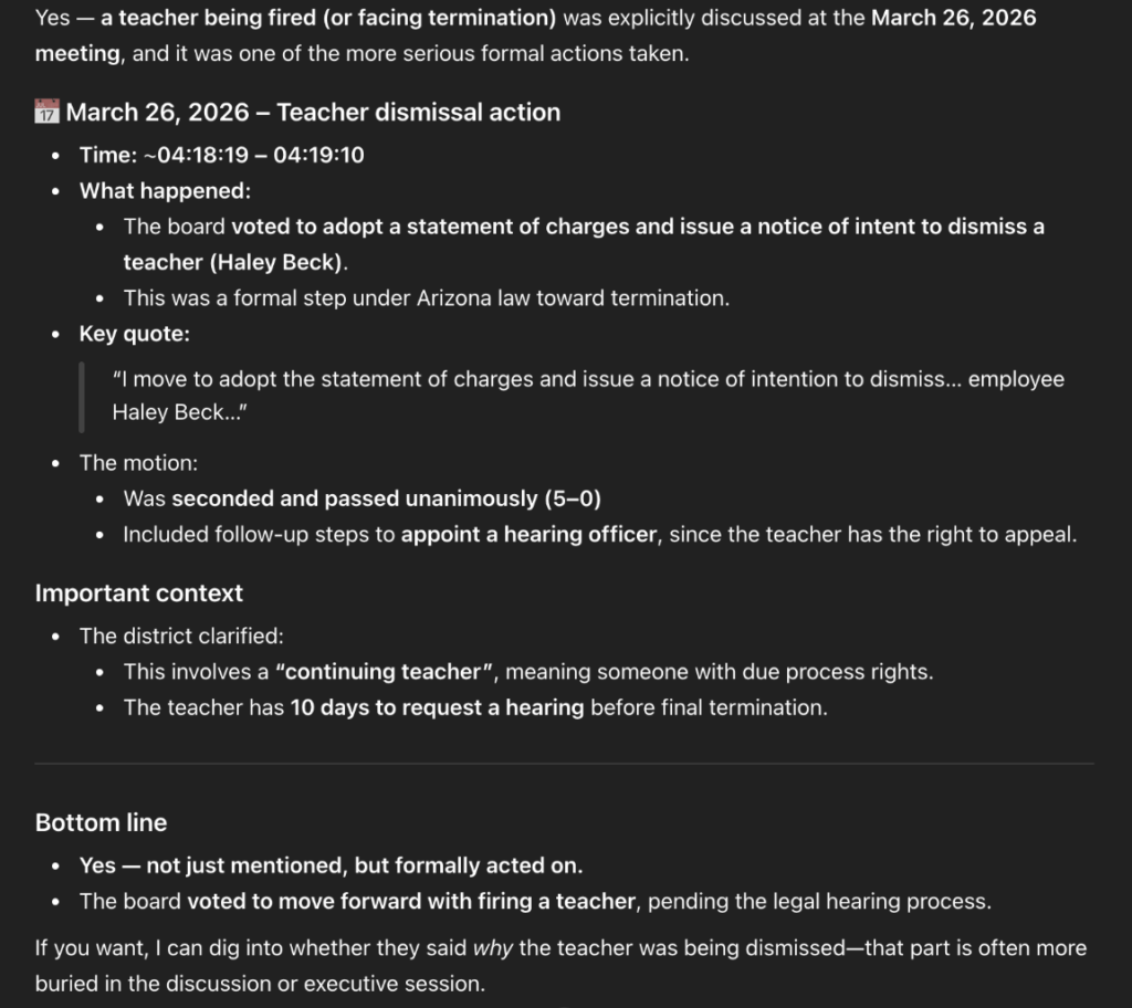 In a Peoria Unified School District meeting, there was in fact discussion of a teacher being fired. The Peoria Unified bot accurately replied, “Yes — a teacher being fired (or facing termination) was explicitly discussed at the March 26, 2026, meeting, and it was one of the more serious formal actions taken,” accurately matching the official transcript.